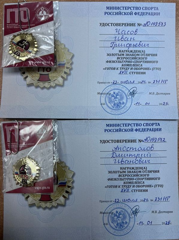 Сотрудники Климовского филиала ГБПОУ "БАТ имени Героя России А.С. Зайцева": Апостолов Дмитрий Иванович и Часов Иван Григорьевич, успешно выполнившие нормы ВФСК ГТО в своих возрастных категориях, получили золотые знаки отличия